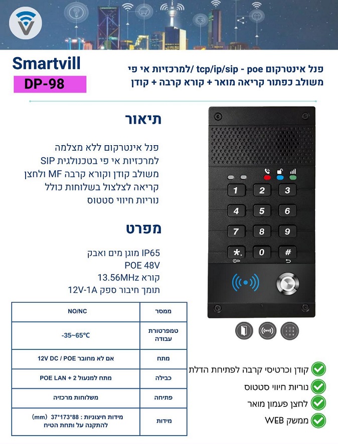 פנל אינטרקום SIP מעוצב ללא מצלמה כולל לחצן קריאה וקורא כרטיסי קרבה לתנאי חוץ SmartVill DP-98 PoE