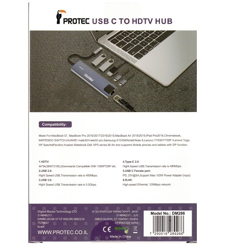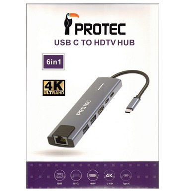 תחנת עגינה למחשב נייד דוקיננג מיני מולטיפורט למחשב נייד 6 ב- 1 כולל יציאת רשת ג'יגה ותצוגה פרוטק Protec DM286 6in1 USB-C to HDTV HUB 4K