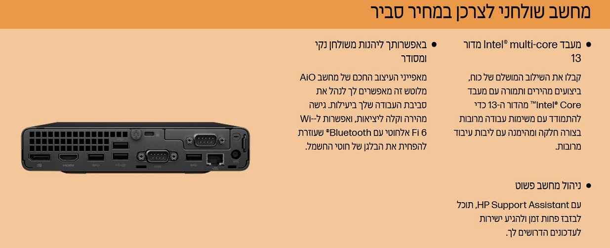 מחשב נייח מיני עסקי אינטל דור 13 אייץ'.פי HP 9M9J2AT 260 G9 Mini Pro Intel Core i5-1335U 10 Cores 12MB Cache 4.6GHz 8GB DDR4 512GB NVME WiFi Free Dos