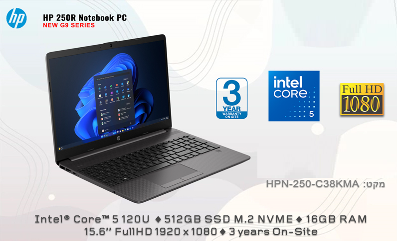 מחשב נייד 15.6 אינץ' אינטל אולטרה סדרה 1 אייץ'.פי HP C38KMAT 250 G9 15.6 Inch FHD Intel Core 5 120U 10 Cores 12MB Cache 5.0GHz 16GB DDR4 512GB NVME Free Dos Dark Ash Silver