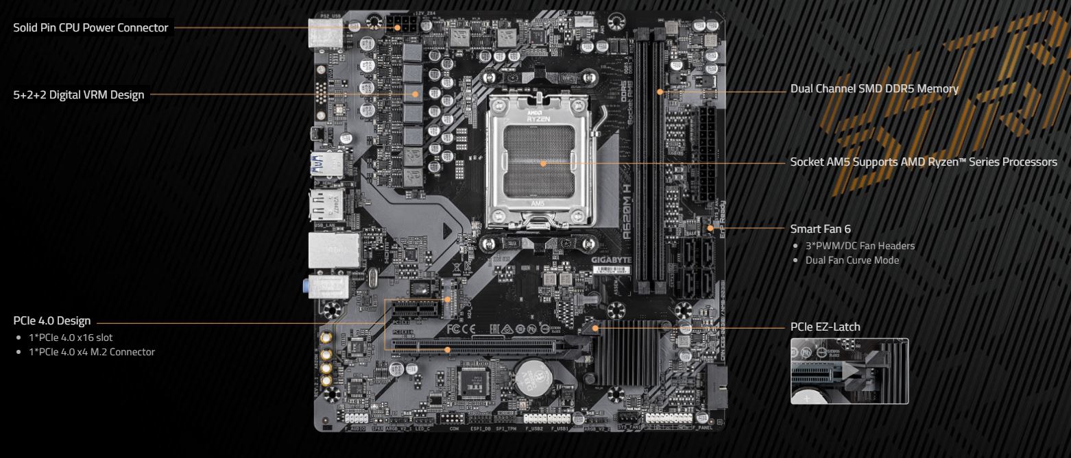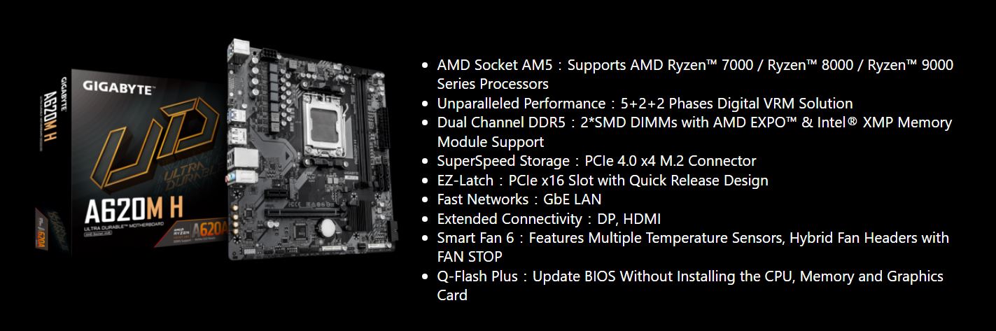 לוח-אם למעבד AMD רייזן AM5 ג'יגהבייט Gigabyte A620M H 2.1 AM5 DDR5 mATX HDMI DP 1GbE
