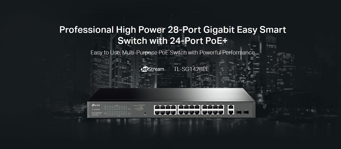 מתג מנוהל לארון תקשורת 28 כניסות 26 כניסות גיג'ה 24 כולל מתח לכל ערוץ 2x SFP 1GbE טיפי-לינק TP-Link TL-SG1428PE 28-Port Gigabit Easy Smart Switch with 24-Port PoE+ 250W