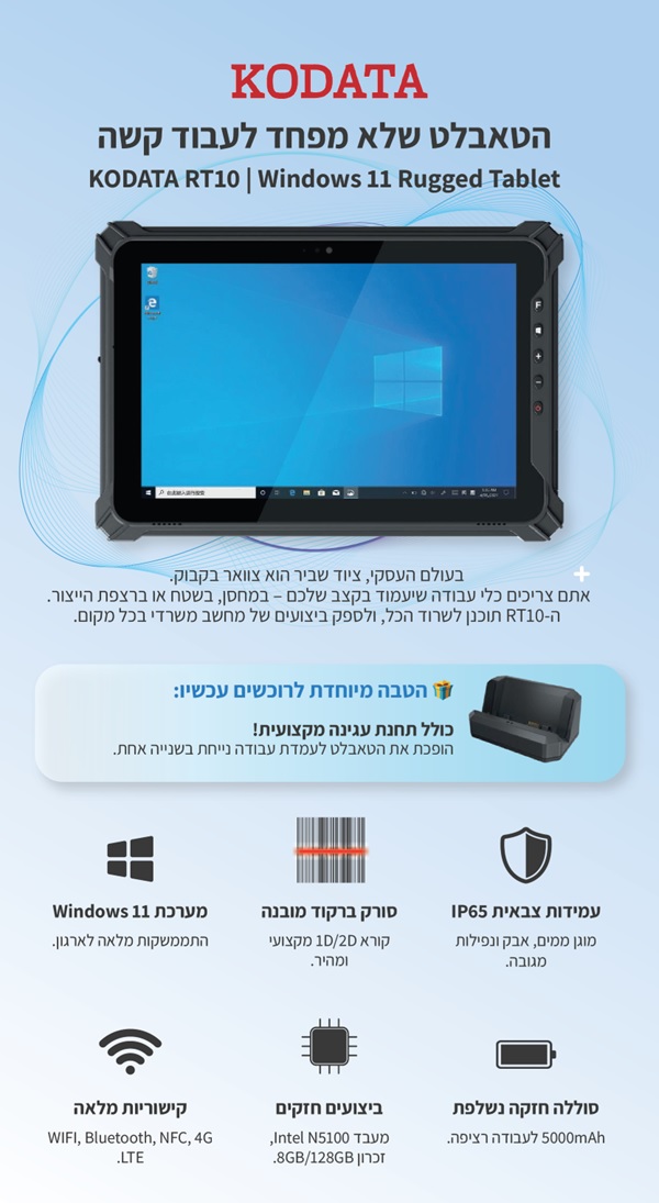 טאבלט צבאי מוקשח 10.1 אינץ' 4G LTE נגד מים, אבק ונפילות תקן IP65 כולל מסופון סורק ברקוד מובנה 1D/2D קודטה KODATA RT10 10.1 Inch Intel N5100 8G RAM 128GB 4G LTE NFC BT WiFi IP65 1D/2D Barcode Scanner 5000mAh Battery Windows 11