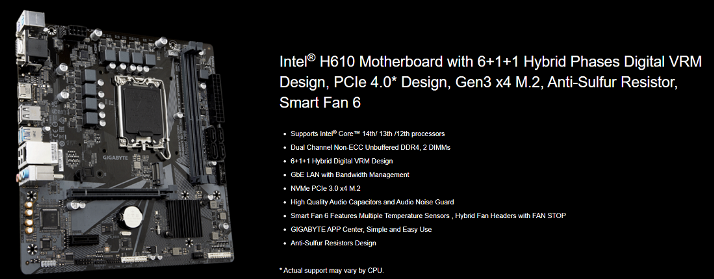 לוח-אם למעבדי אינטל דור 12/13/14 ג'יגהבייט Gigabyte H610M H V3 DDR4 mATX LGA 1700 PS/2 VGA HDMI GbE