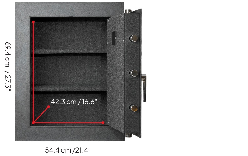 פנים הכספת מרופד בשטיח מלא כדי להגן על פריטים מפני שריטות וכולל מדפים מתכווננים ונשלפים לארגון.